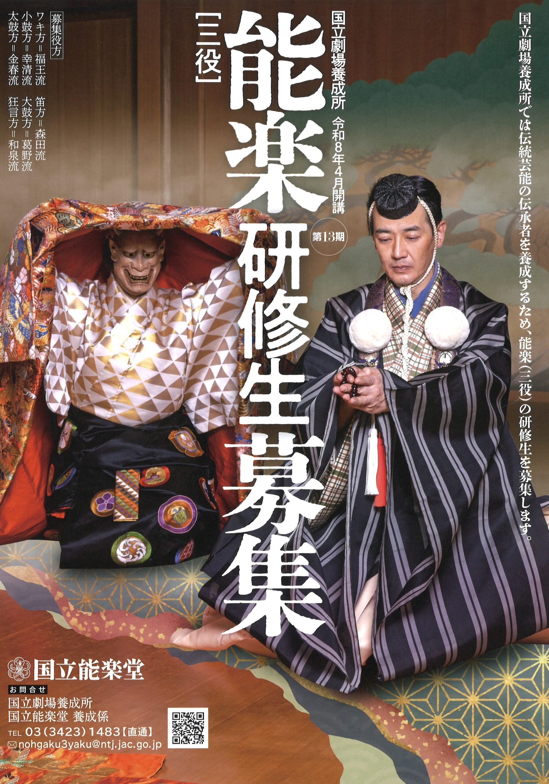 国立劇場養成所では、能楽(三役…ワキ方、囃子(笛・小鼓・大鼓・太鼓)方、狂言方)の伝承者を養成するため、一般社団法人日本能楽会、公益社団法人能楽協会、能楽宗家会と協力して、将来舞台で活躍する志をもつ能楽(三役)研修生を募集します。